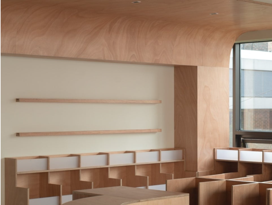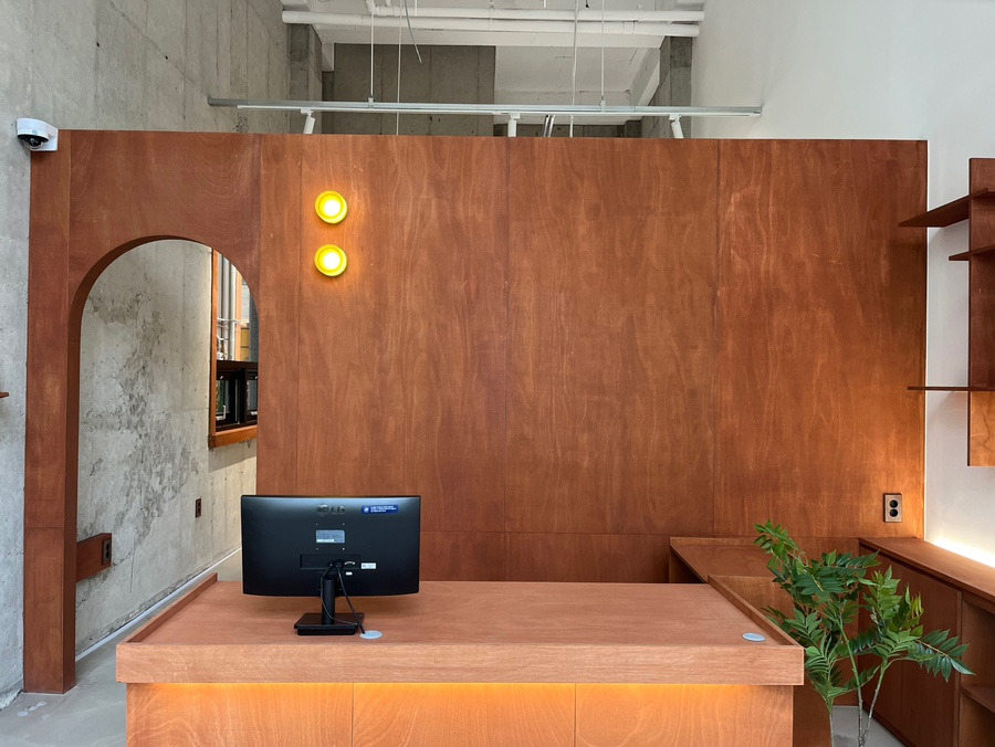 오쿠메합판이 실제로 사용된 카페 인테리어 벽면 마감 예시입니다.